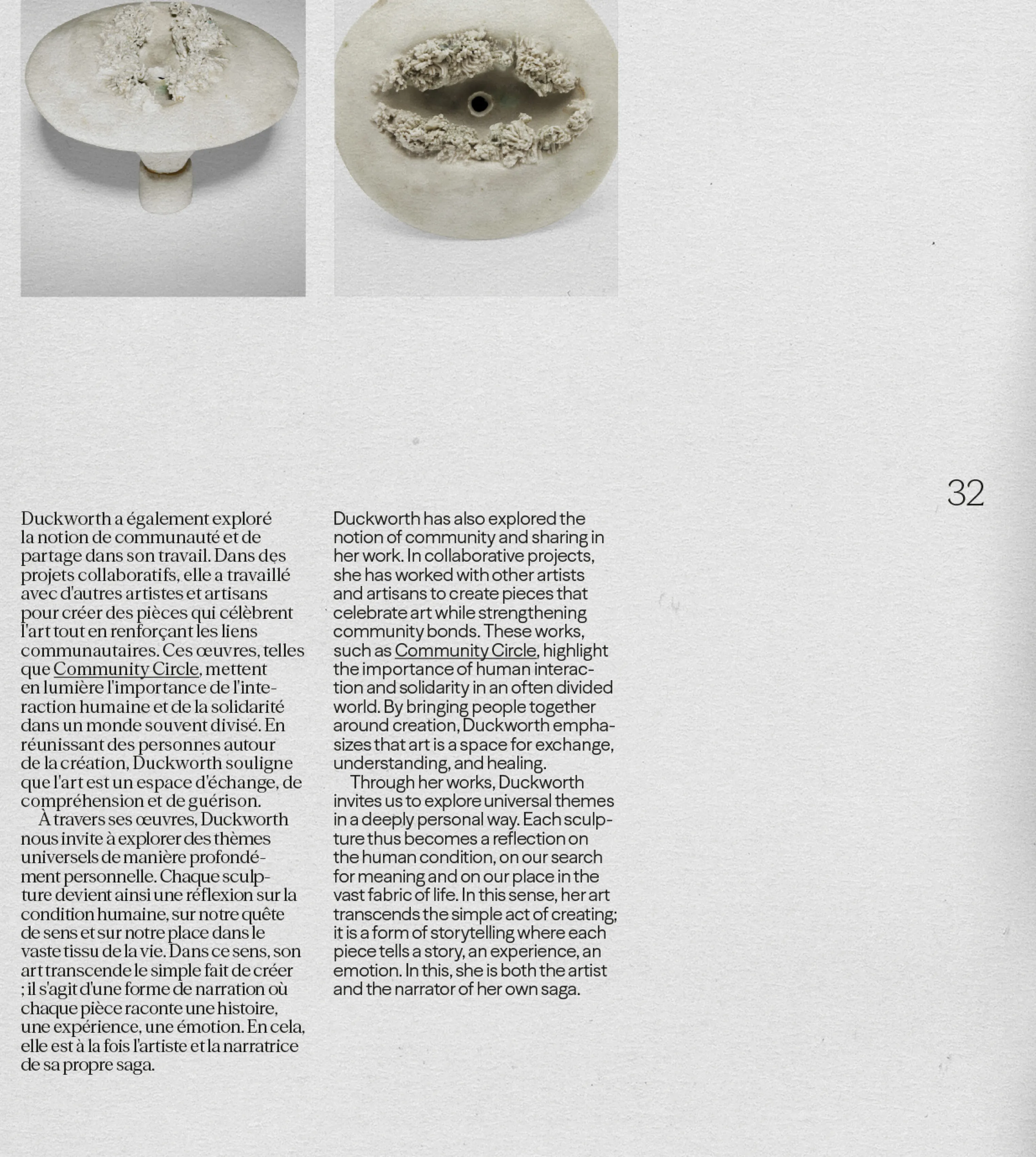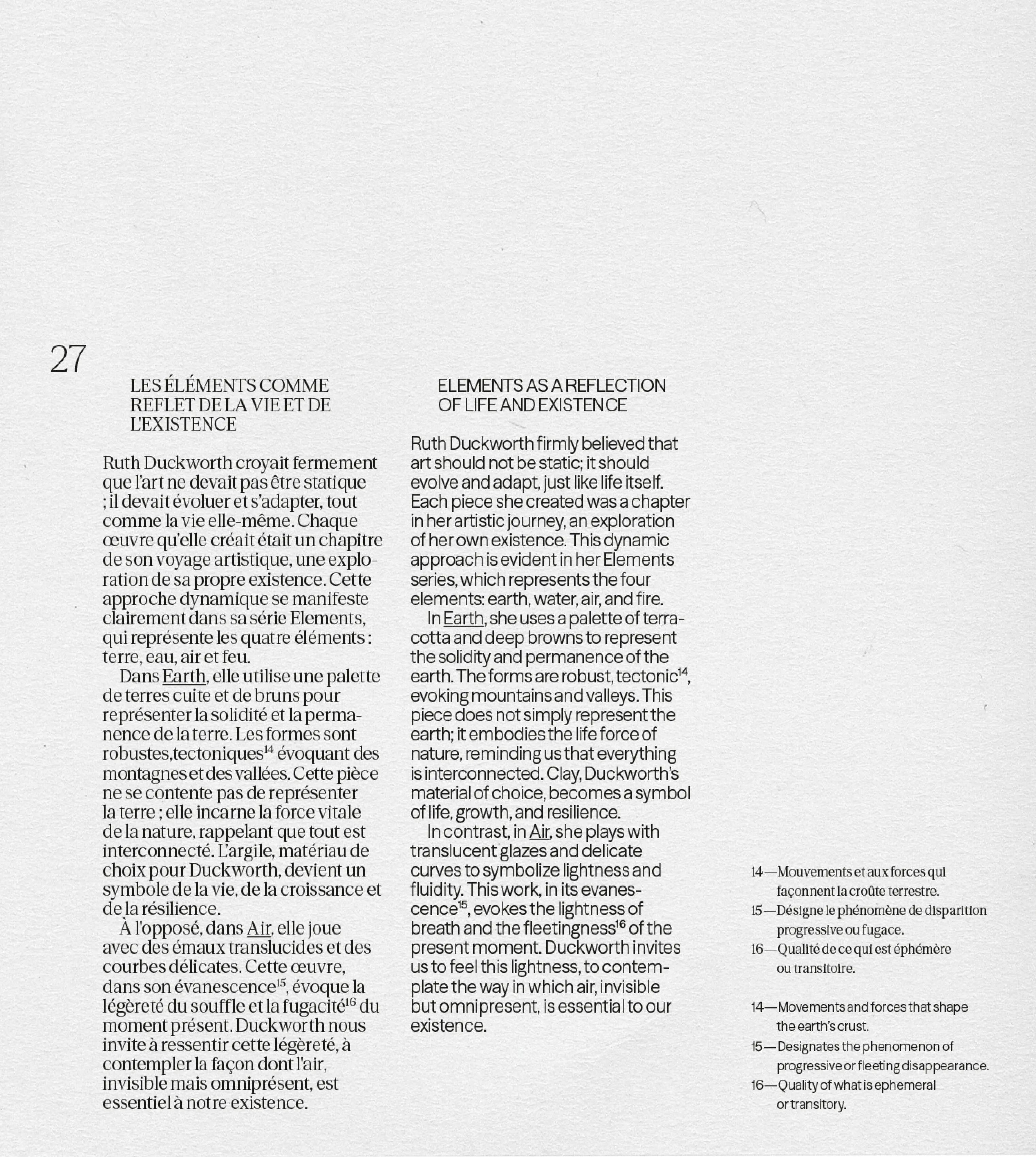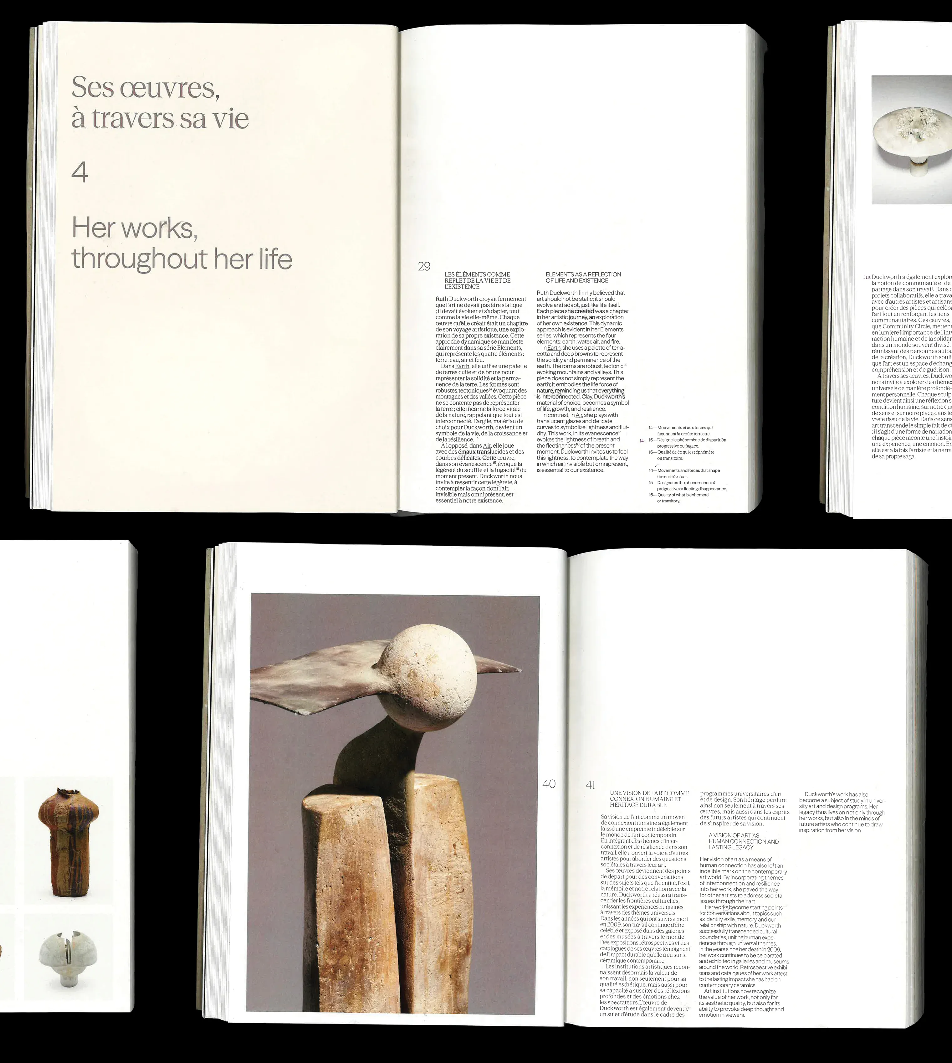 The bilingual content, in French and English, is distinguished by a thoughtfully chosen typography: sans-serif for the English and serif for the French, ensuring a fluid reading experience while maintaining a harmonious aesthetic. This book invites readers to discover the timeless world of Ruth Duckworth, where simplicity and purity of form are expressed with elegance.